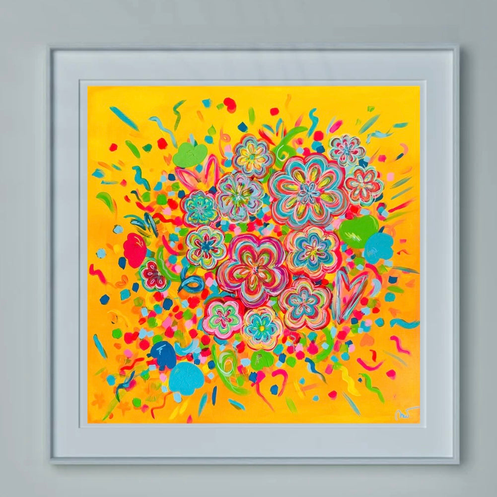 with its bright, vibrant colors against a sunny, warm orange background, this print will immediately bring a sense of joy and energy to the room, a real eye-catcher that will put a smile on your face every day.